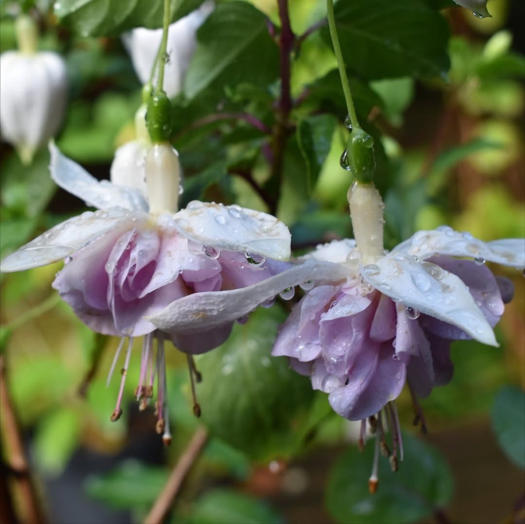 Fuchsia Blue Veil (bild 3) är en sagolikt vacker sort jag haft 15 år. Den får stora blommor i romantiskt vitt och ljusblått/lavendel som senare rodnar mot mer rosa när blommorna nästan blommat över💙🌸🤍