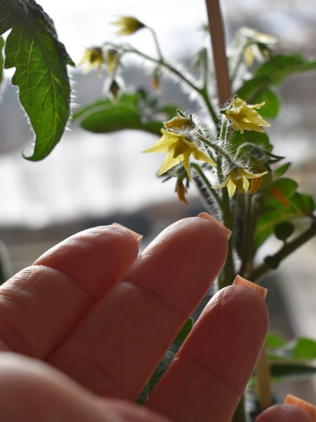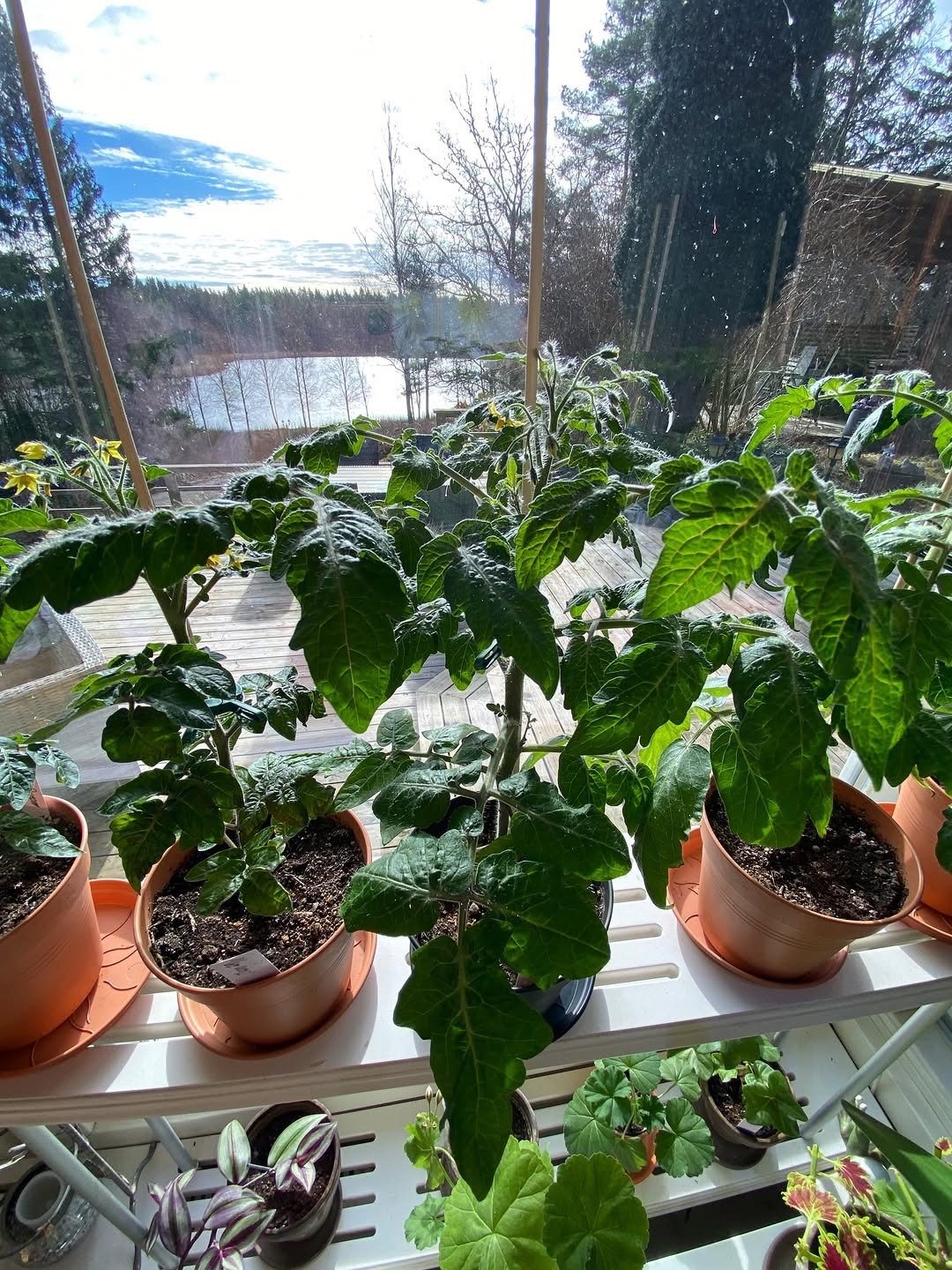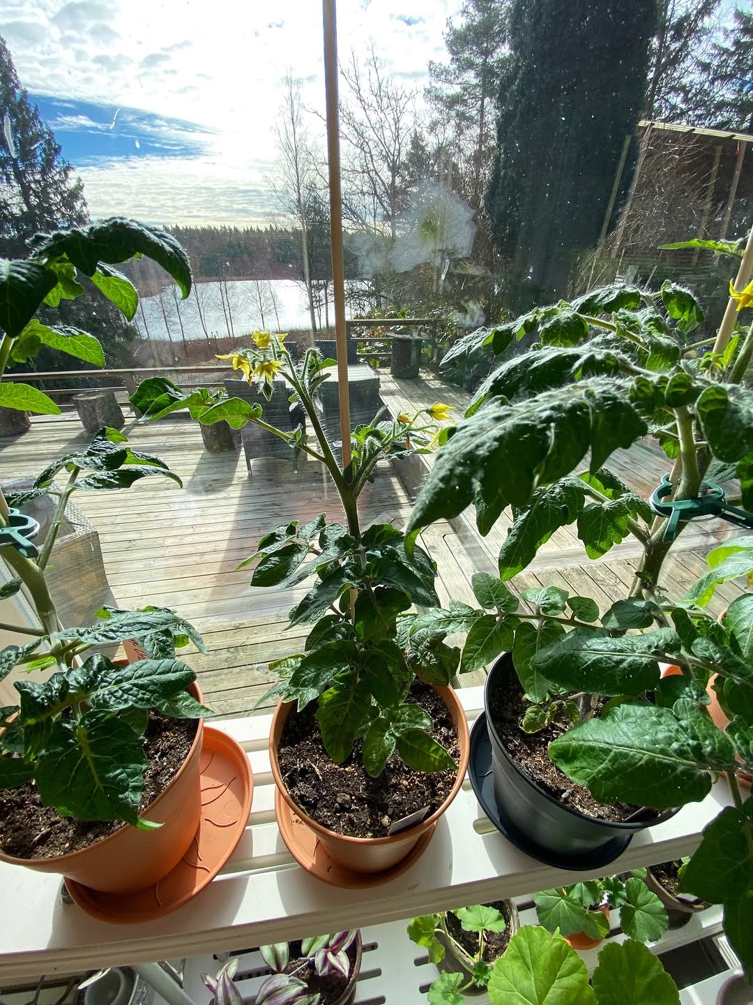 Båda tomatplantorna är för övrigt små behändiga microdwarf tomater eller fönstertomater som det också kallas. Eller hela raden som står här microdwarf. De är sådda redan i mitten på november förra året så det är inte så snabba som man kanske skulle tro. Fast det beror mest på att de fått klara sig ganska mycket själva och varit lite övergivna då och då i ett ganska mörkt odlingsrum med halvdan växtbelysning. I vilket fall så är fönstertomater extremt tacksamma. De håller sig nästan oavsett behandling, knubbiga och fina och ränner inte iväg i höjd och blir rangliga. Dessutom nu när några av dem fått flytta till den här fönsterhyllan och när vårsolen nu börjar lysa starkare och starkare så kommer de troligtvis stortrivas och explodera i växtglädje 🏠📏🪴🗓️🌑💡💪☀️💥🌿